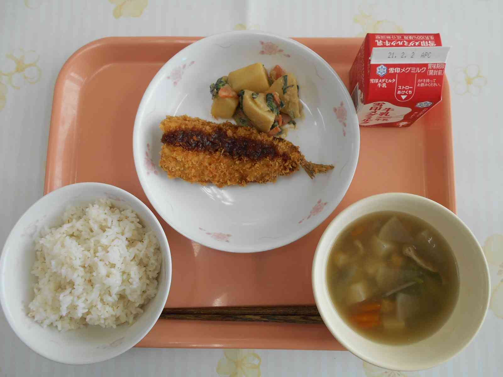 ○牛乳 ○麦ご飯 ○鰯(いわし)フライ ○じゃが芋の練りごま和え ○みぞれ汁 ☆一口メモ☆ みぞれ汁は、みぞれの雪を表現した大根おろしが入っています。今日は汁物にしましたが、もっとたっぷりの大根おろしを使って、みぞれ鍋にしてもおいしくいただけます。冬ならではの料理で、体をあたためてくれます。大根おろしは、すりおろして生のまま食べると、大根のキリッとした辛みが味わえますが、汁物に入れて火を通すことで辛みが飛んで、大根の甘味が味わえます。【添付ファイル】
