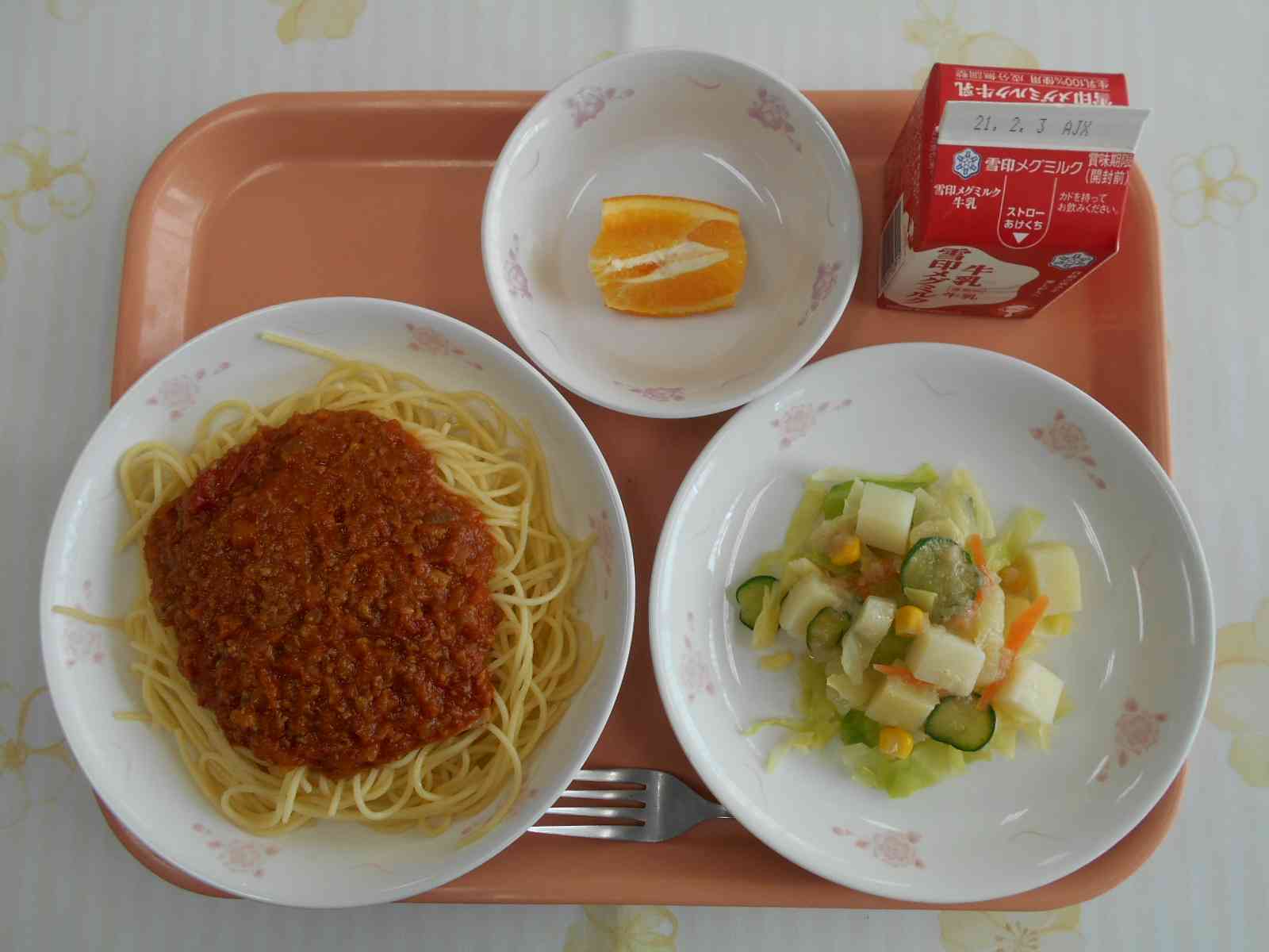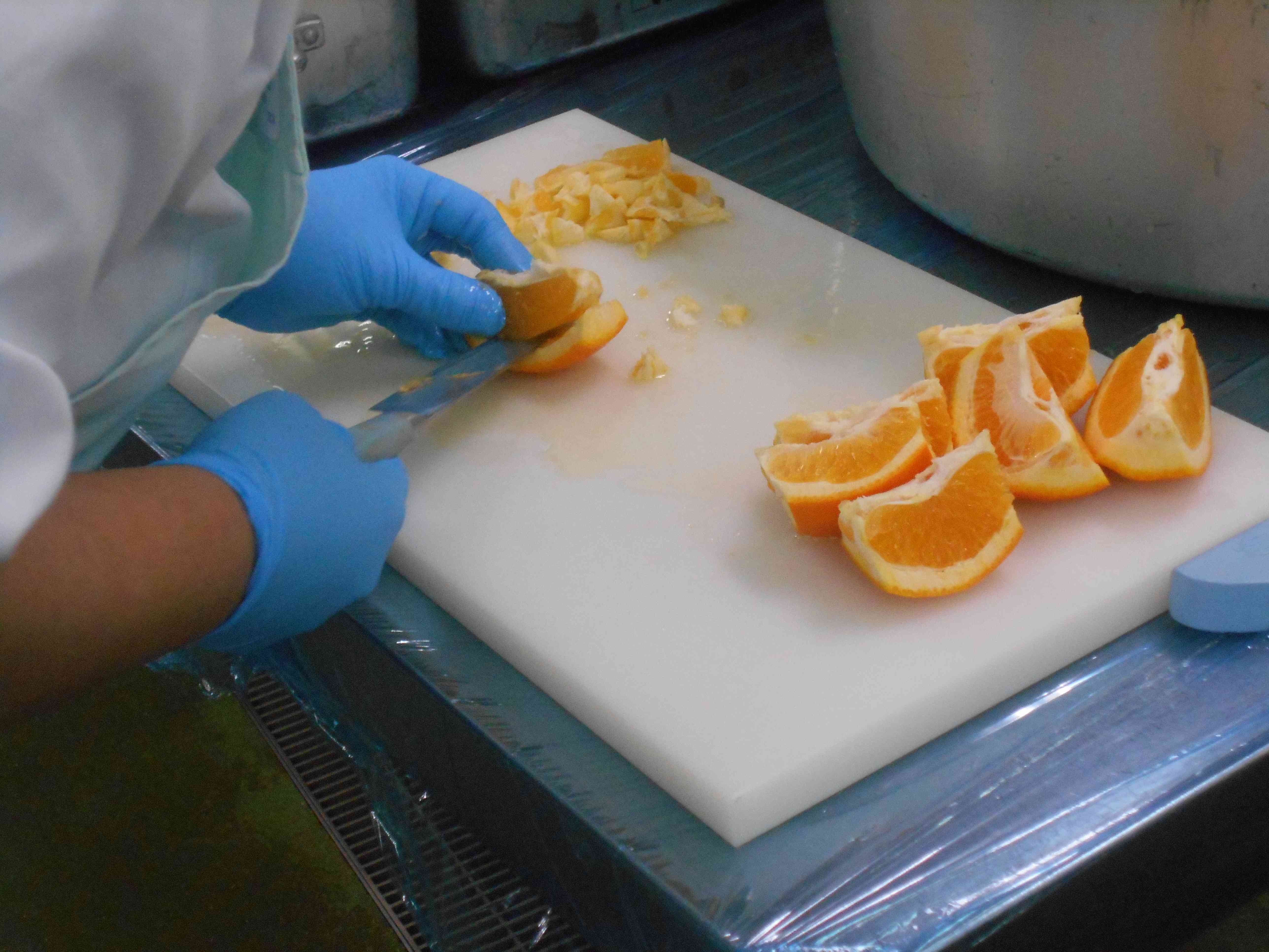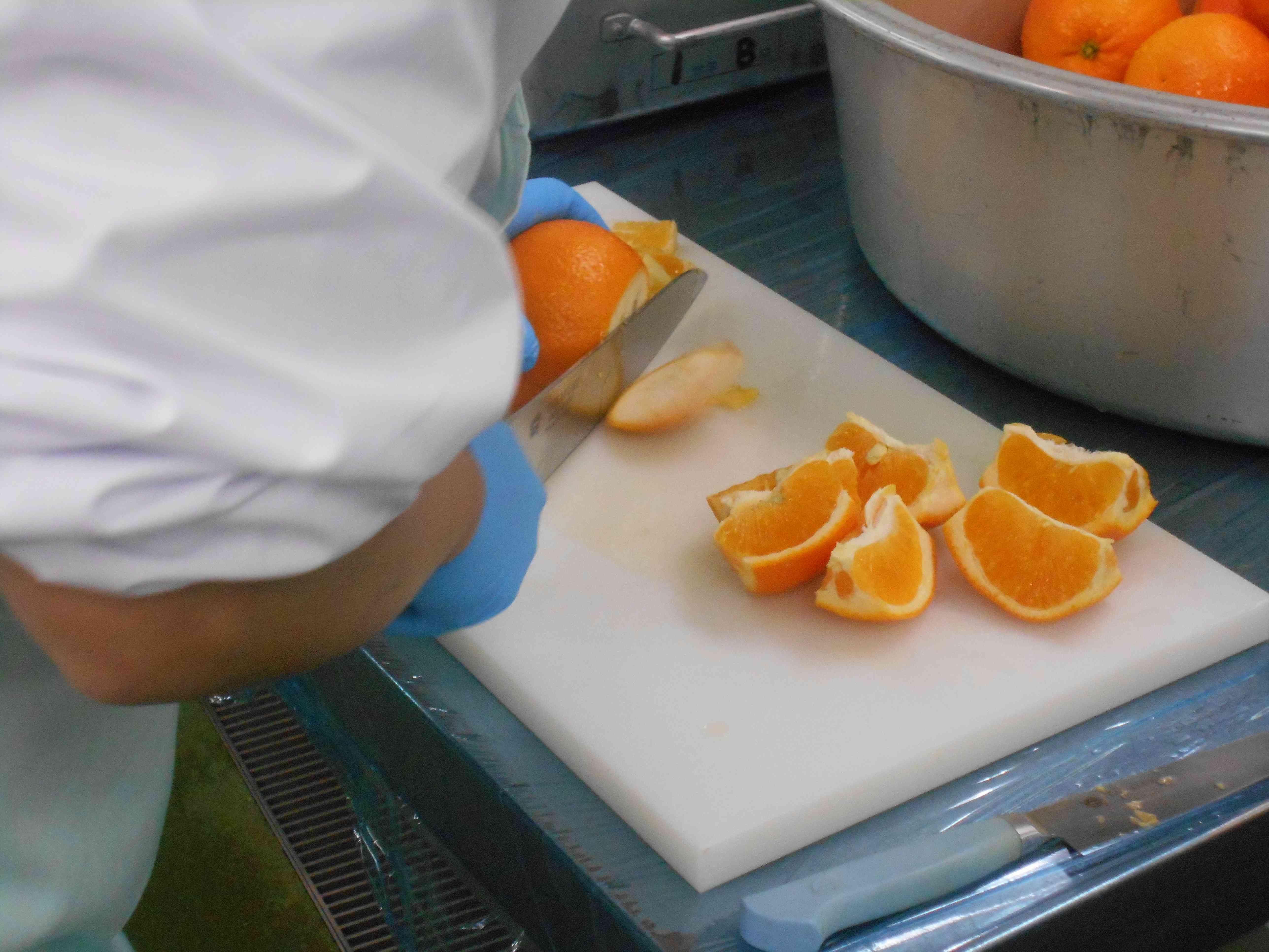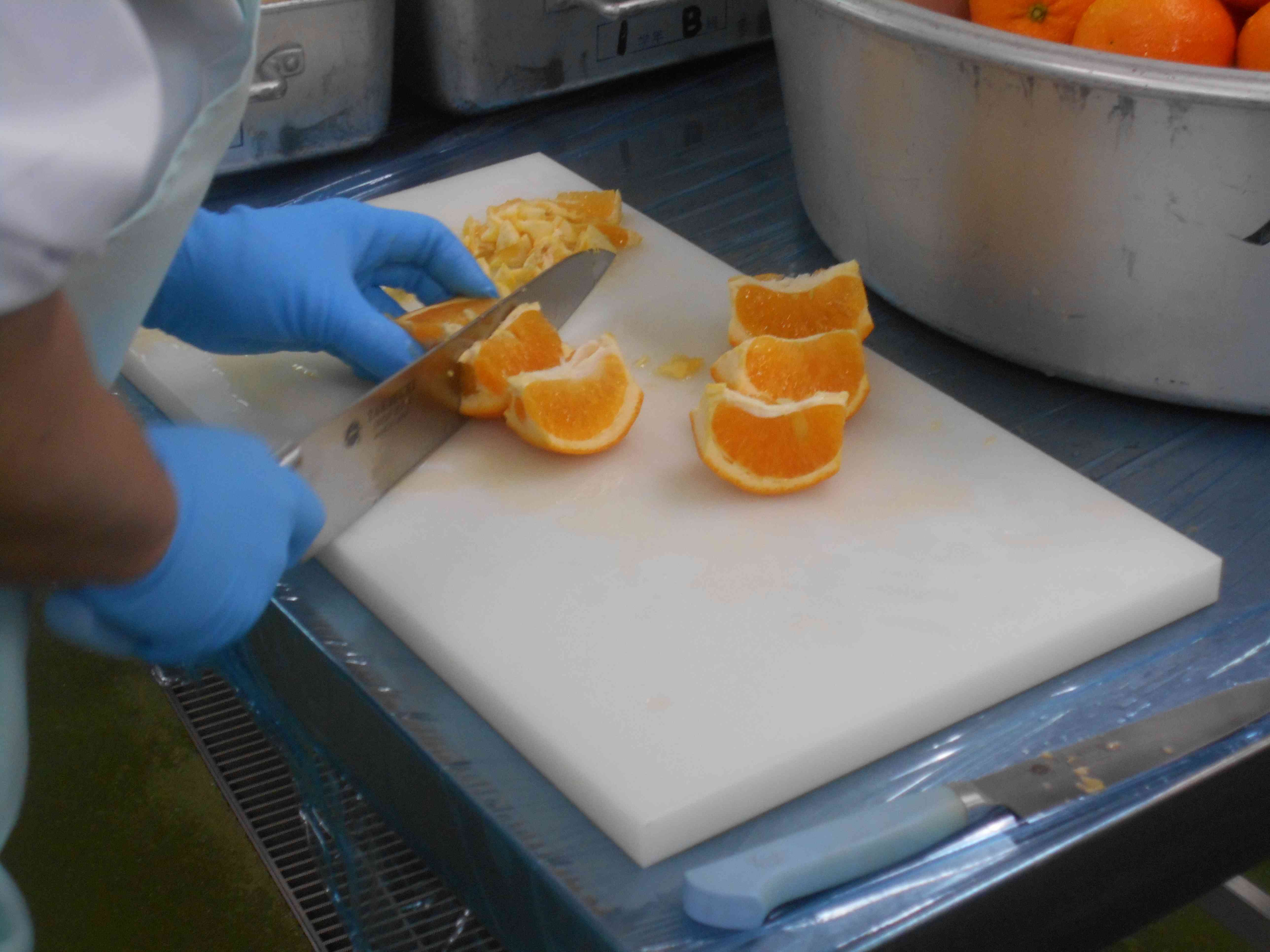 ○牛乳 ○スパゲッティミートソース ○じゃが芋入りサラダ ○いよかん ☆一口メモ☆ 国産のかんきつ類がおいしい季節になり、店頭には、さまざまな名前のかんきつ類が並び始めました。ほとんどのかんきつ類は、鮮やかなオレンジ色の皮で、同じように見えるかもしれません。しかしながら、いよかん、はっさく、はるみ、せとかなど、品種ごとに甘味と酸味のバランス、果汁の多さが違うため、異なる味わいです。これからの季節、2月、3月にかけて給食でも色々な品種のかんきつ類を食べられます。ぜひ、品種の名前と、それぞれの味の特徴を感じてもらいたいと思います。 写真2~4枚目 いよかんのカットの様子です。皮ごときれいに洗った後は、 まず、ヘタ側とおしり側の皮を切り落として(写真2枚目) ↓ 6等分に切り分けます。(写真3枚目) ↓ 皮と果肉の間に切れ目を入れました。(写真4枚目) 献立の組み合わせによっては、写真4枚目のような切れ目を入れることができないこともありますが、なるべく食べやすいように提供しています。 ※「スパゲッティミートビーンズ」の予定でしたが、「スパゲッティミートソース」に献立を変更いたしました。【添付ファイル】