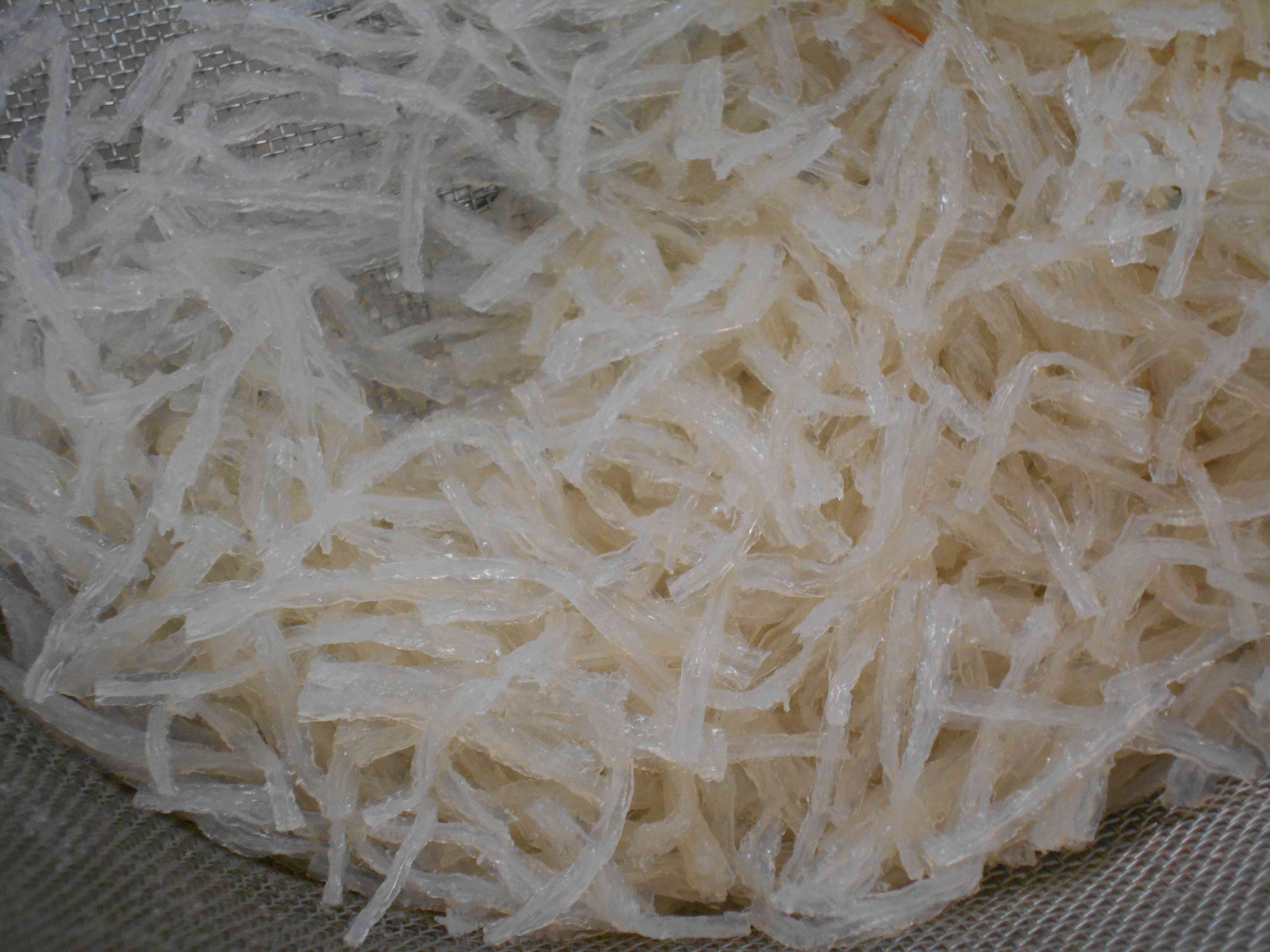<東京都の地場産物の献立> ○牛乳 ○ひじきご飯 ○肉じゃが ○糸寒天サラダ(伊豆諸島の糸寒天) ○はちみつりんごゼリー(東京産はちみつ) ☆一口メモ☆ 東京都の地場産物を使った献立です。 サラダの糸寒天は、東京都八丈島で加工されたものを使いました。糸寒天は、 伊豆諸島が主産地のテングサ科の海草テングサを天日乾燥させたものから作ります。 給食ではさっとゆでて 、水でよく冷やしてサラダにしました。 ゼリーに使ったはちみつは、東京都多摩産でした。 写真2枚目 糸寒天を100度の沸騰したお湯でゆでてしまうと、糸寒天の表面が溶けてしまって、冷却したときにくっつき合ってしまいます。1本1本きれいな形を保ちつつ、食材を加熱する衛生管理のルールを守るために、ゆでるお湯の温度に気をつけて作りました。 温度計でお湯が85度になっていることを確認してから、1分間ゆでることで、きれいな仕上がりにできました。 写真3枚目 糸寒天、にんじん、小松菜、もやし、キャベツを混ぜて、さっぱりとした味のドレッシングをかけました。ゆでた糸寒天のつるっとした食感を楽しめるサラダです。 ※予定では、肉じゃがのじゃがいもは八王子にある「とうきょう元気農場」で育てた東京都産のじゃがいもの予定でした。残念ながら、生育が良くなかったため他県産のじゃがいもに変更して提供しました。【添付ファイル】