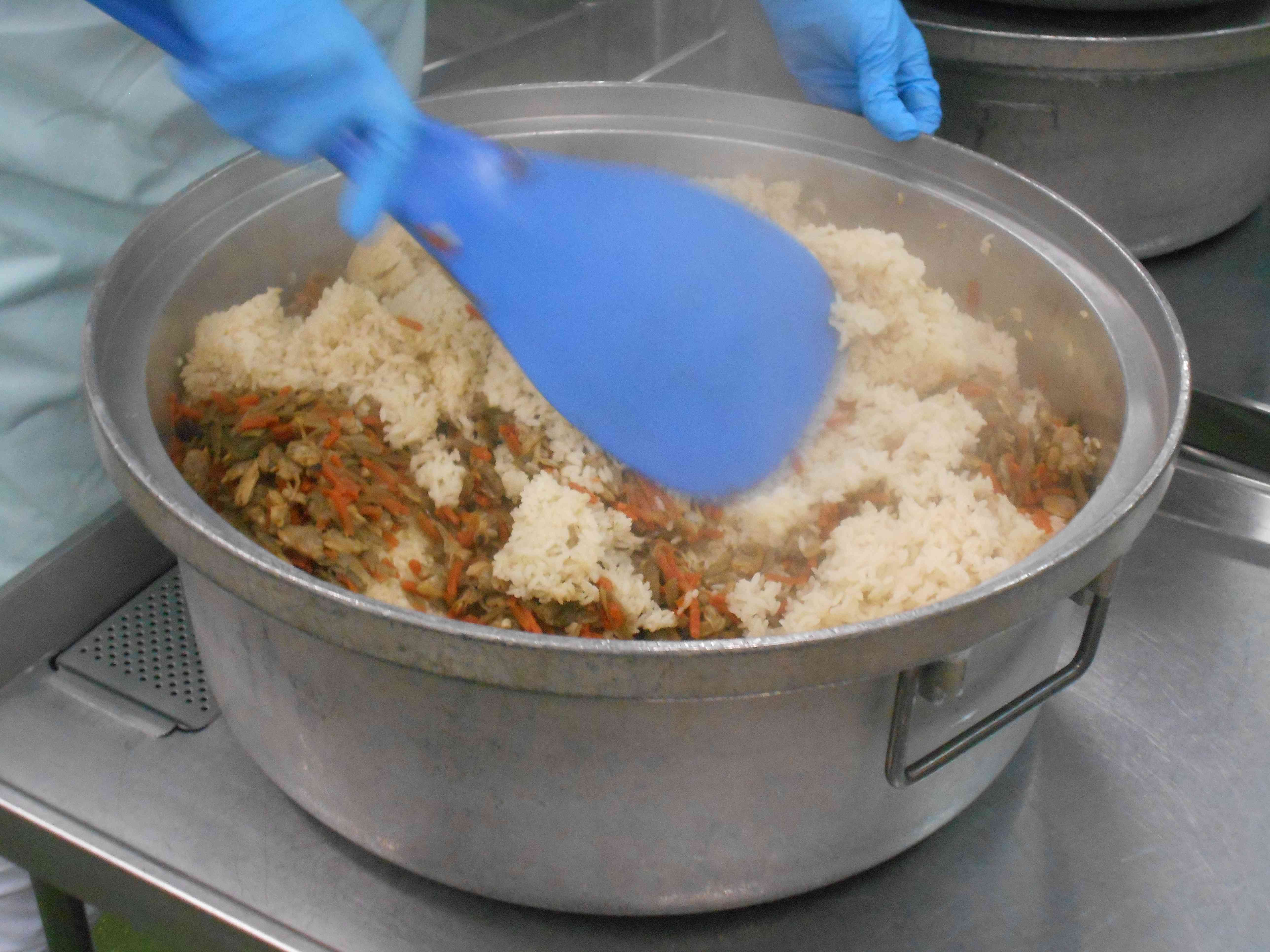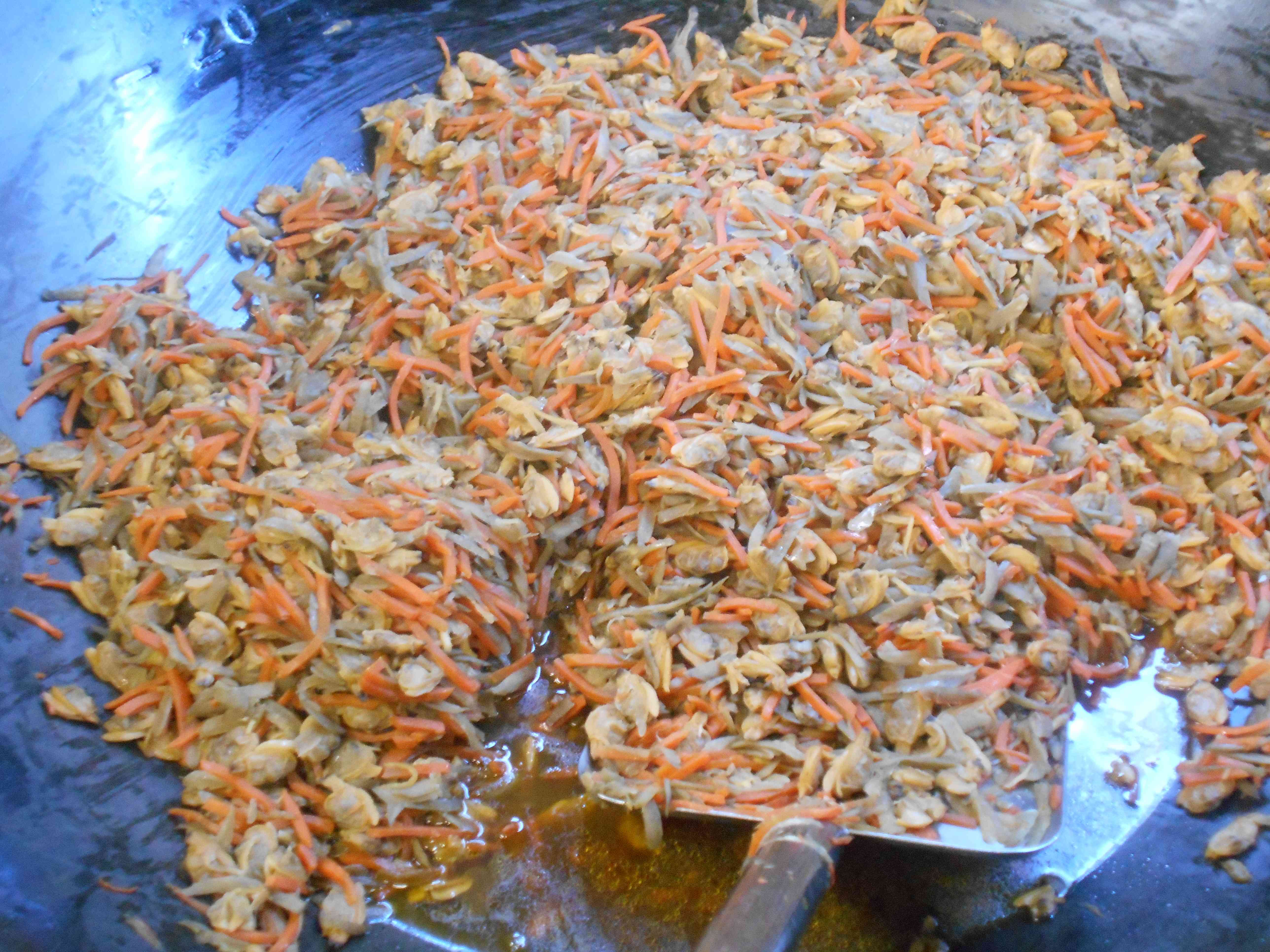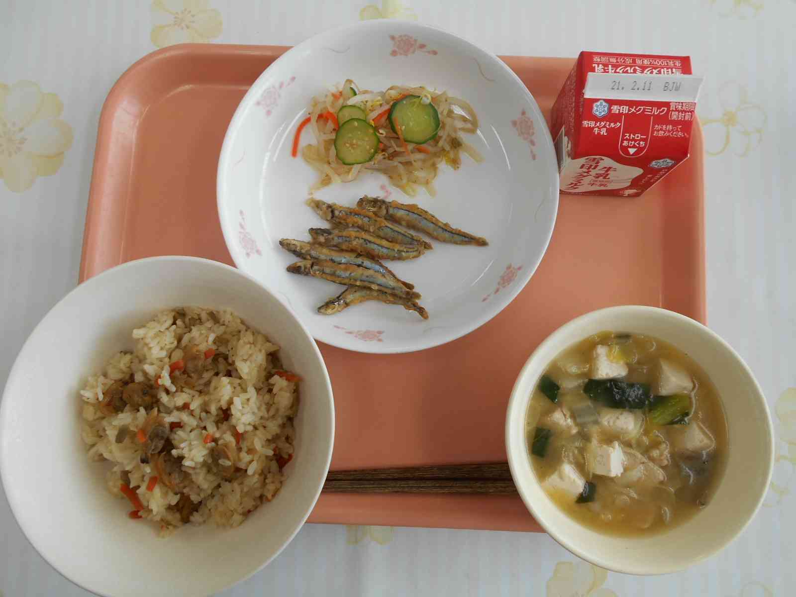 <東京都の郷土料理> ○牛乳 ○深川飯 ○きびなごのから揚げ風 ○野菜のごま酢和え ○味噌ちゃんこ風汁 ☆一口メモ☆ 東京都の郷土料理の献立です。 深川飯は、わたしたちの江東区に伝わる郷土料理です。 江戸の頃、隅田川沿いの深川は漁師町。漁師達はとったばかりのあさりを船の上で煮て、しょうゆで味付けしてご飯にかけて食べていました。 また深川から木場にかけては、木材をたくさん扱っていたので、それを管理する職人もいて、忙しい時にあさりのむき身と豆腐などを煮た汁をご飯にかけて食べていました。 近年になると、あさりの炊き込みご飯を深川飯と呼ぶようになりました。給食の深川飯もあさりの炊き込みご飯です。あさりは、しょうがを使って先に煮るので、生臭さが抑えられ食べやすくなっています。深川飯を通して、東京湾の魚や貝が人々の生活と密接に関わっていたことがわかります。 写真2枚目 深川飯の具材は、あさり、にんじん、ごぼう、しょうがです。しょうがの千切りをたっぷり使うことで、あさりの臭みがとれ、しょうがの風味も加わり、いっそうおいしくなります。 しょうがの辛みが強く残らないように、調理員さんが、しょうがをかなり細い千切りに切ってくれました。 写真3枚目 あさりがたっぷり入った具をご飯に混ぜ込んでいきます。お米の炊き水には、あさりを煮含めた煮汁も一緒に入れているので、あさりのうまみが染みこんだご飯になったと思います。 ※写真3枚目 「きびなごのから揚げ」の予定でしたが、「から揚げ風」に変更になりました。 理由は、部品の故障のため、揚げ物専用の回転釜の火かつかなくなってしまったためです。当日の朝のことで急な変更でしたが、スチームコンベクションオーブンを使って、揚げ焼きの料理として提供しました。【添付ファイル】