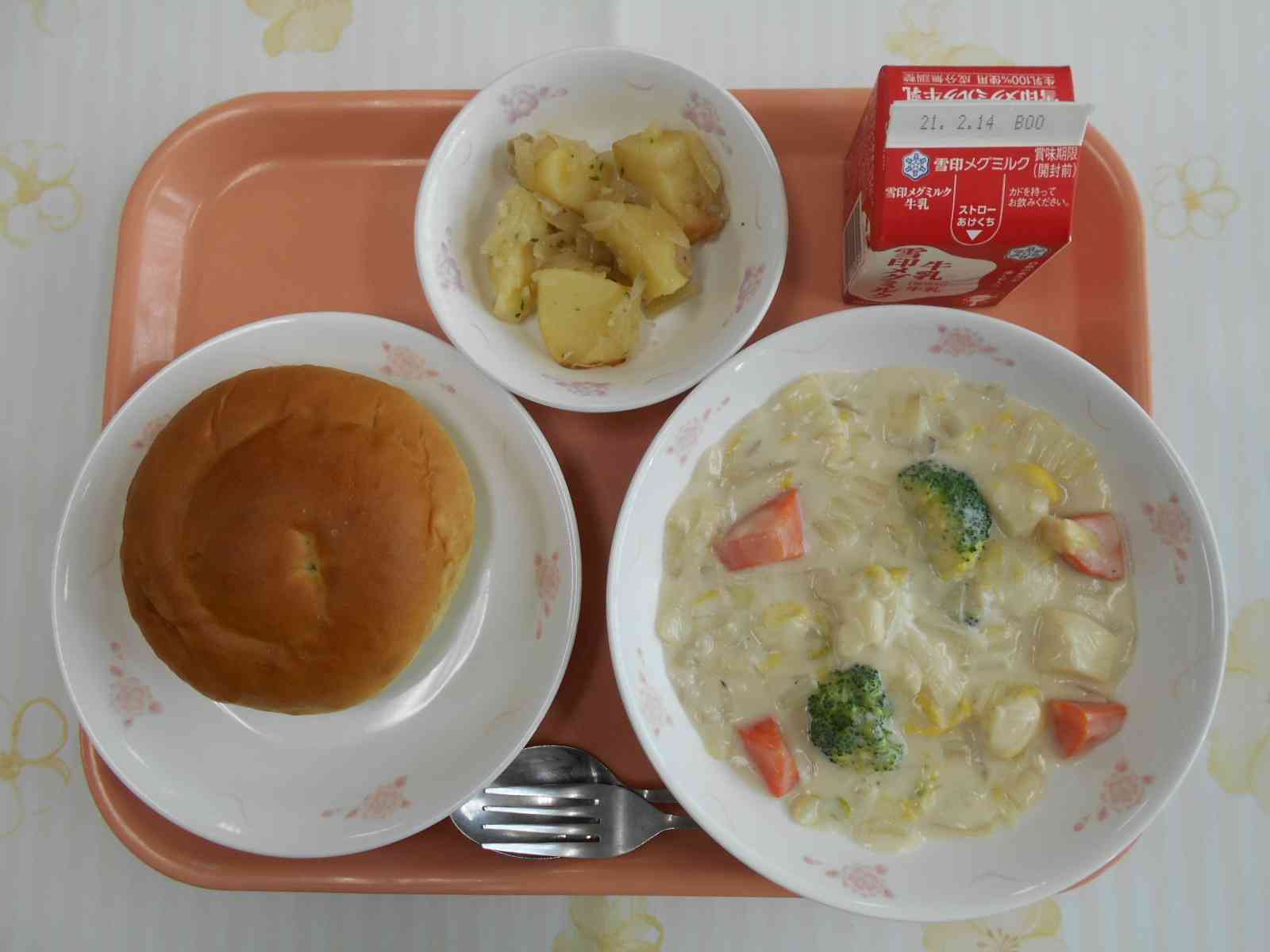 ○牛乳 ○あしたばパン ○鱈(たら)と野菜のクリーム煮 ○ジャーマンポテト ☆一口メモ☆ タラは、冬が旬の白身魚です。身がやわらかく、あっさりとした味わいです。色々な料理に使われていて、特に冬の鍋料理には欠かせません。タラというと「マダラ」が多いですが、他に「スケトウダラ」「コマイ」も日本の近海でとれるタラの種類です。スケトウダラは、主にすり身にされ、かまぼこやちくわなどの練り物に加工されます。卵巣は、「たらこ」や「からしめんたいこ」に加工されます。タラの精巣は白子(しらこ)と呼ばれています。身のあっさりとした味とは異なり、白子は濃厚でクリーミーな味わいです。【添付ファイル】